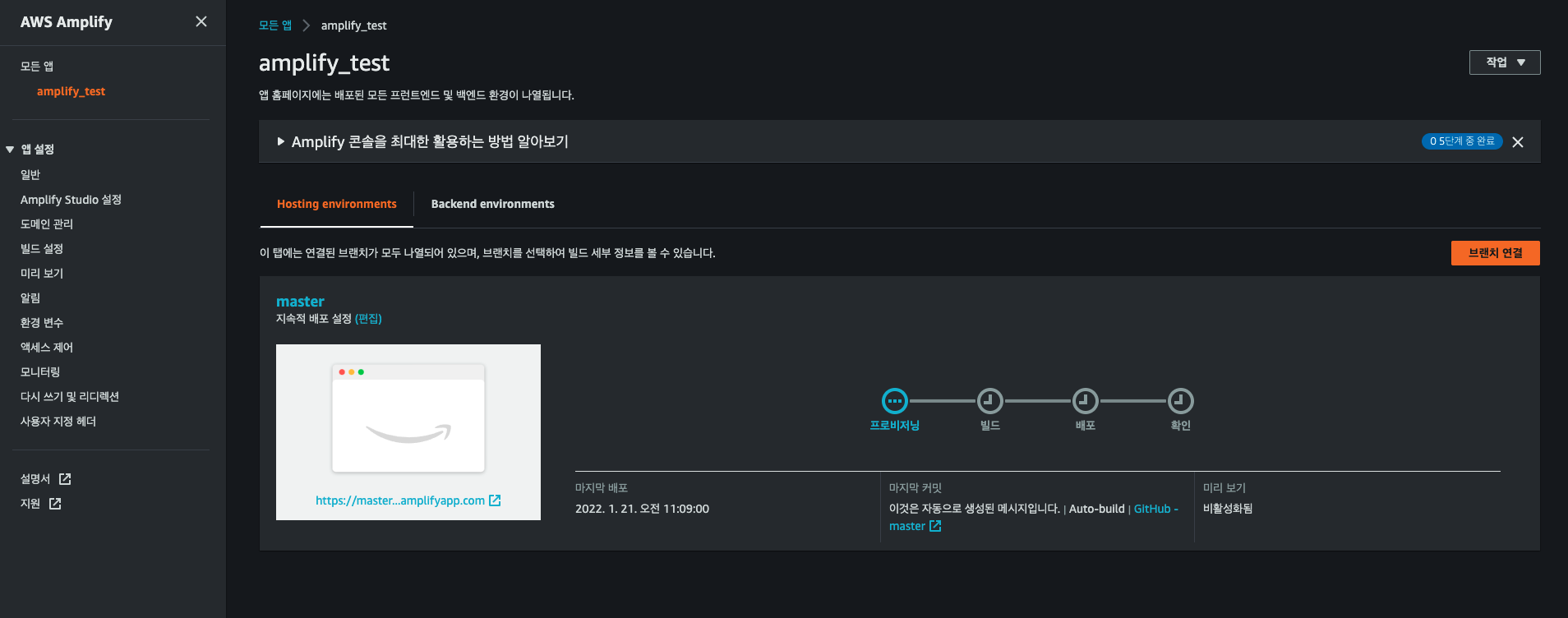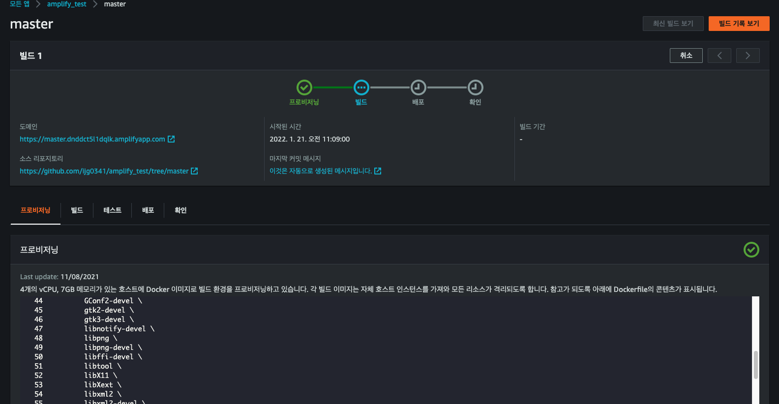 아래 master브런치를 클릭하시면 현재 빌드 진행상황과 도메인이 나온 것을 확인하실 수 있습니다.