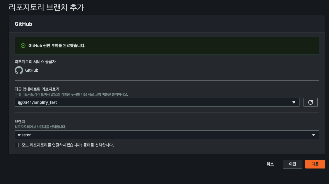 깃헙에 로그인이 돼있는 경우 자동으로 권한 부여 여부를 물어보고 내 깃허브 내에 레파지토리를 가져올 수 있도록 세팅됩니다. 레파지토리를 선택하신 후 다음을 눌러줍니다.