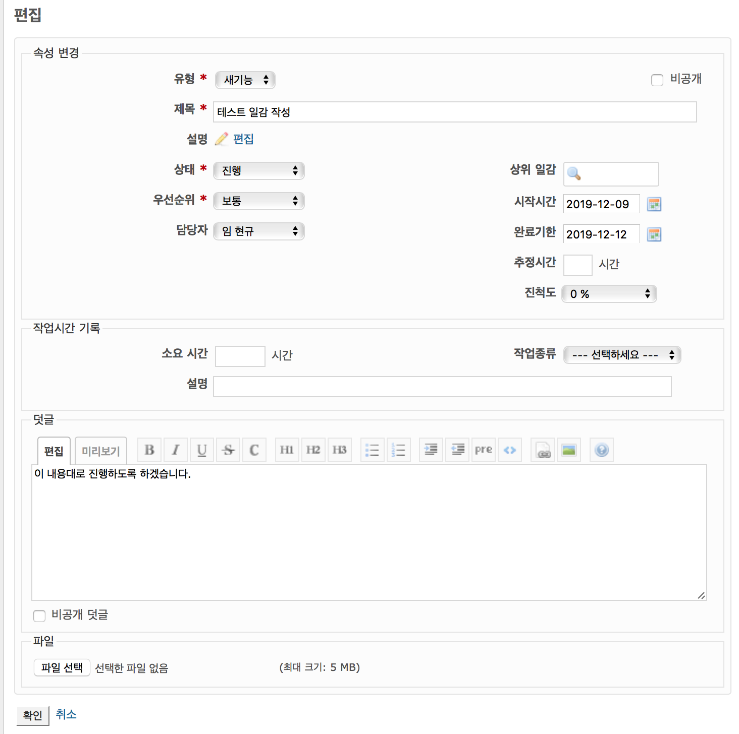 - 일감의 상태를 수정한 후 댓글 내용을 입력한 후 [확인]을 클릭합니다. 이 때 담당자나 관람자에게도 일감이 갱신되었다는 메일이 발송됩니다.
