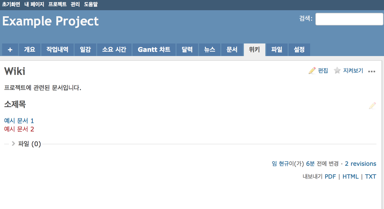 - 프로젝트를 이동한 후 레드마인 상단에 [위키] 버튼을 클릭합니다.