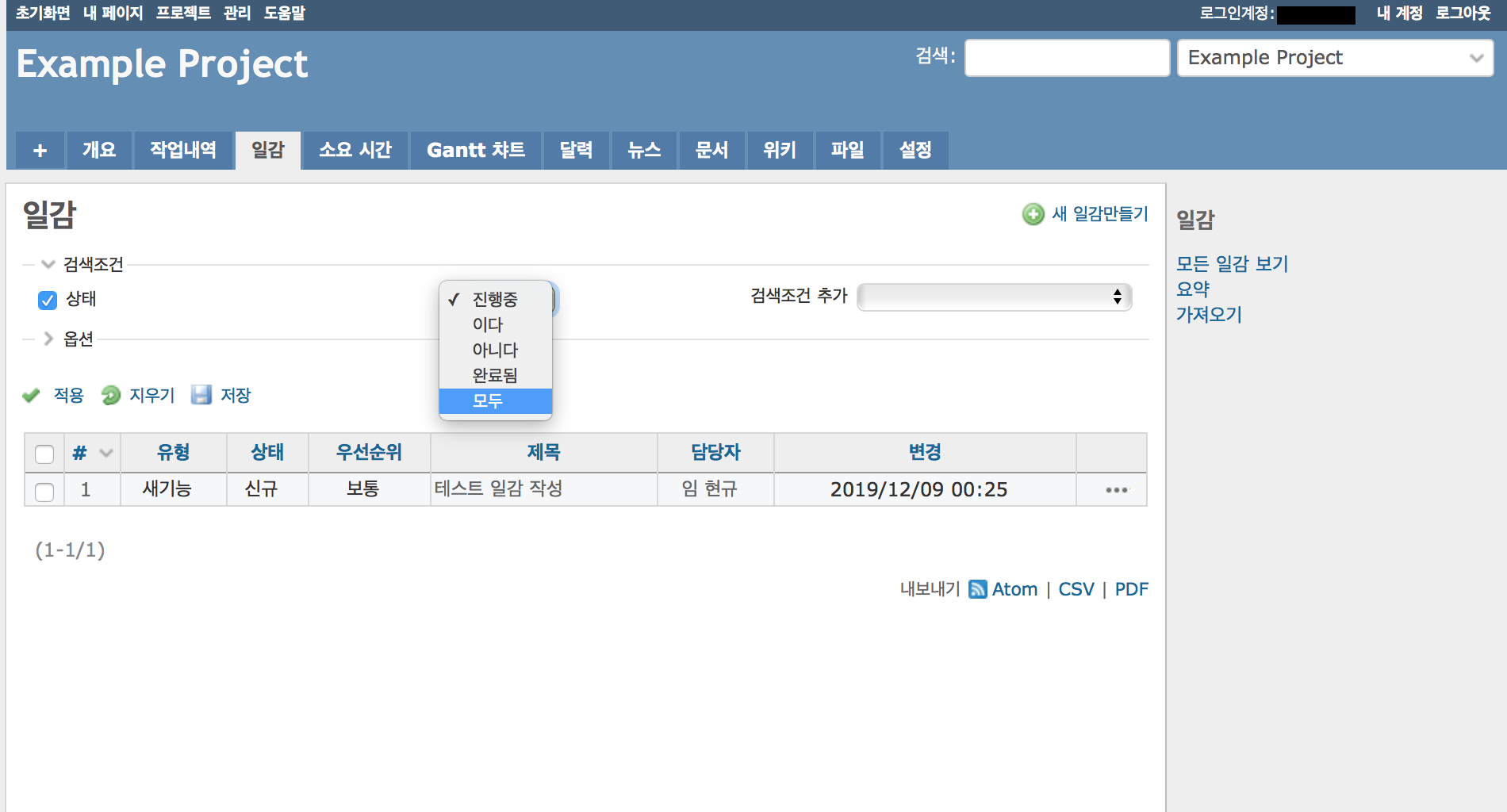 - 과거에 완료된 일감까지 표시하길 원하시는 경우 "상태"를 "모두"로 변경하시고 [적용]버튼을 클릭합니다.