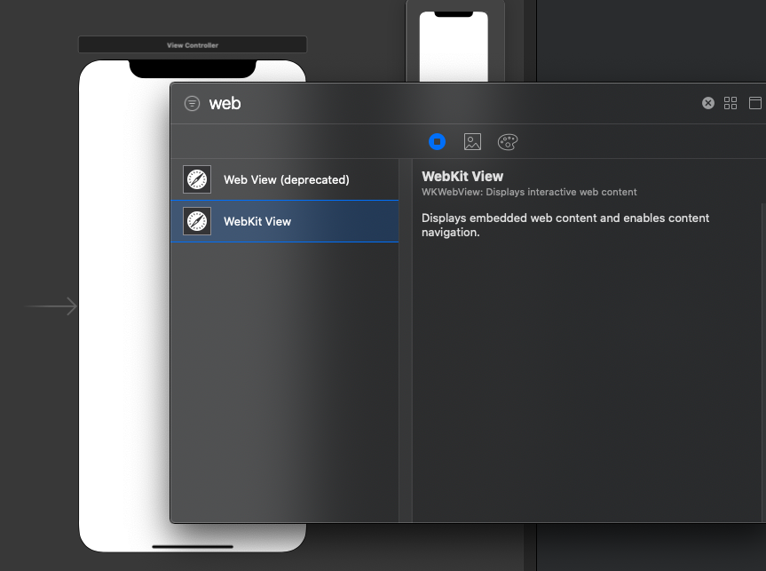 WebKit View를 화면에 추가한 뒤 여백 없이 화면을 꽉 채운 뒤 webView라는 이름으로 아웃렛을 연결한 후