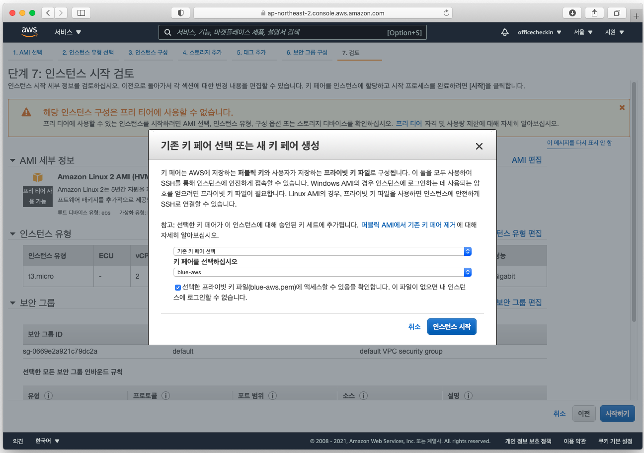 SSH 접속 시 key pair 설정에서 생성하거나 다운로드 한 pem 파일이 필요합니다.