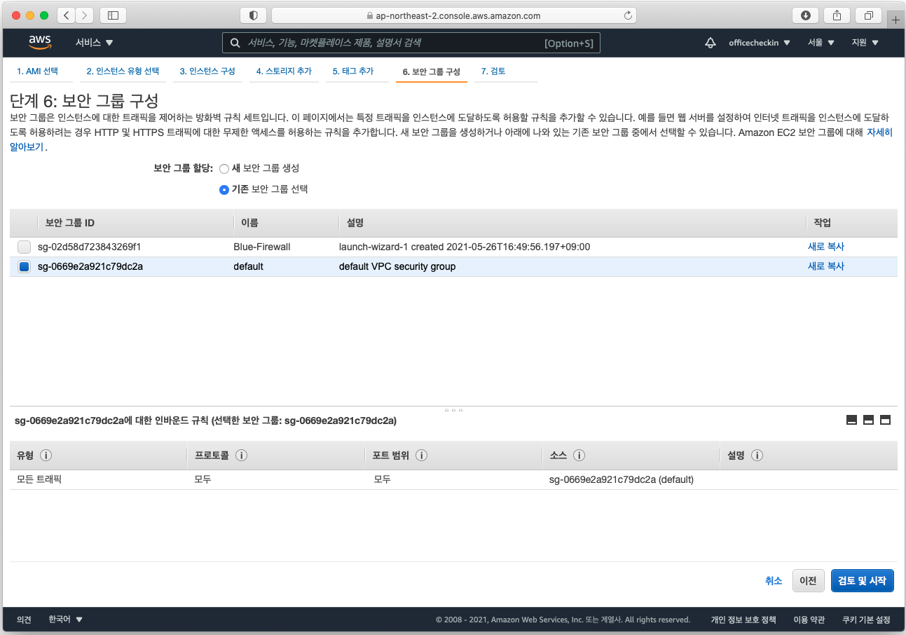 새로운 보안그룹을 생성하여 ssh 포트를 열거나 전체 포트를 열어주시기 바랍니다.