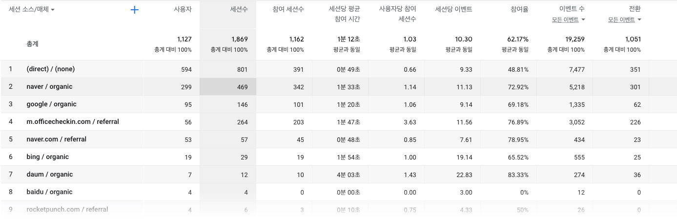 예를 들어 ‘오피스체크인’ 사이트 방문 트래픽 획득 세션 소스/매체를 본다면 절반 이상이 직접 URL 주소를 입력해 접속했으며, 그다음으로 네이버 검색 엔진을 통한 접속이 많음을 알 수 있습니다. 이 내용을 토대로 검색을 통한 유입을 늘릴 수 있는 방안이 필요함을 알 수 있습니다.