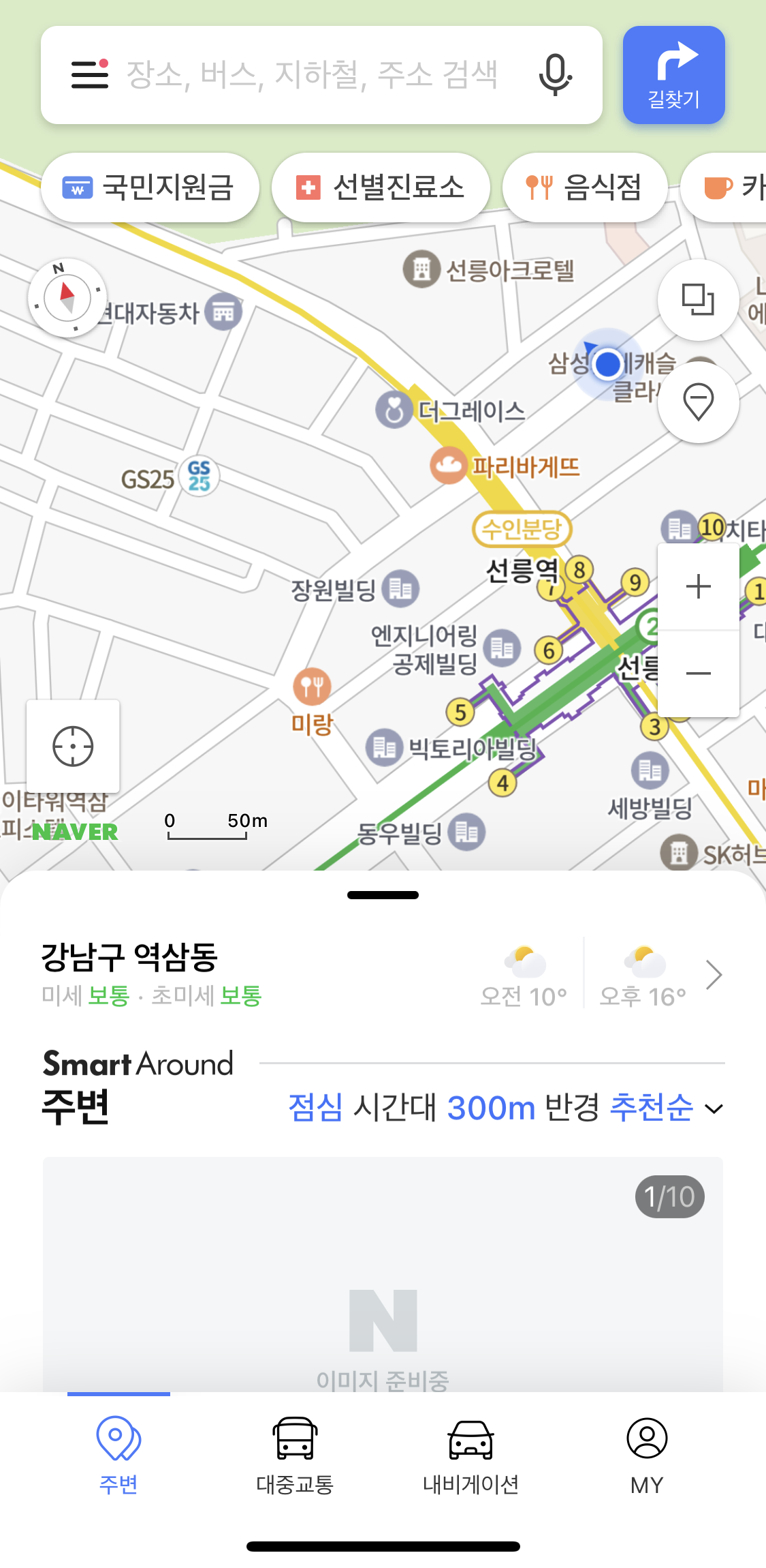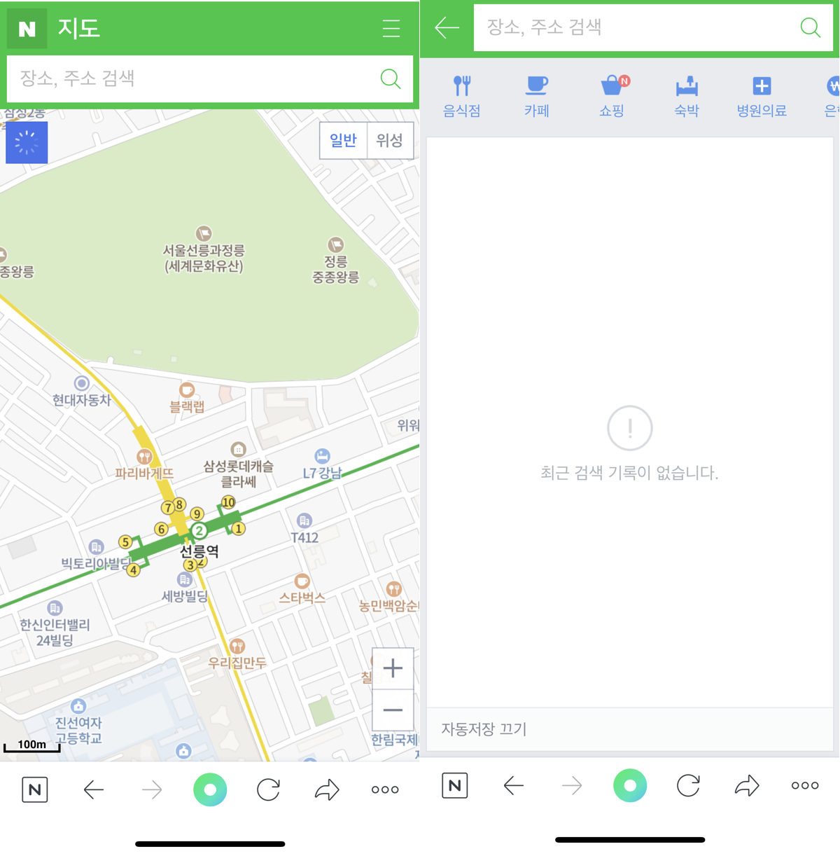 오피스체크인의 모바일 웹과 모바일 앱 서비스는 거의 동일한 화면을 제공하고 있지만 완전히 다른 화면으로 서비스를 제공하는 경우도 존재합니다. 예를 들어, 네이버 지도의 경우 모바일 웹에서는 검색창 클릭 전에는 해당 지역 인근의 음식점, 카페 등 아이콘을 통해 선택하는 창이 없는 반면에, 모바일 앱에서는 검색창과 별개로 선택할 수 있습니다. 그 외에도 앱 서비스에서는 해당 지역 근처의 맛집, 인기 있는 장소 등을 추천해주는 등 다른 서비스를 제공하고 있음을 알 수 있습니다.